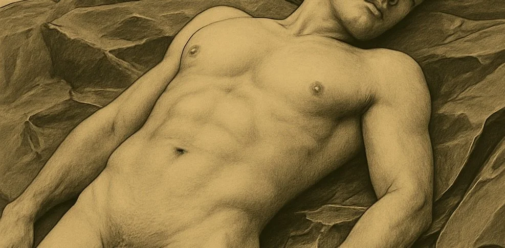 Deeply defined abdominal muscles. Masculine, yet soft facial features. Full lips, dimpled chin, strong shoulders, and the kind of pectoral muscles you want to lay your head on. His pelvic region forms a V, guiding the eye to his perfectly sculpted erection. Thick, muscular legs.